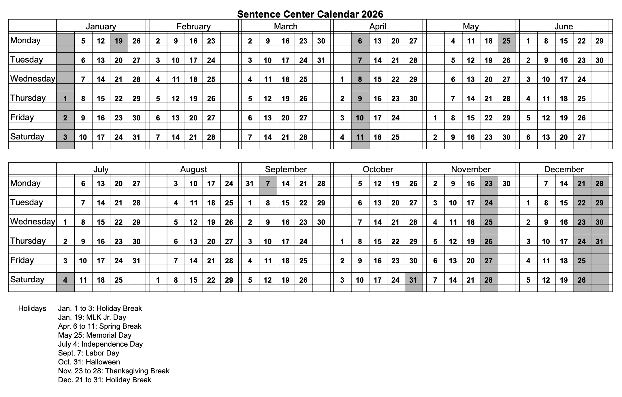 the 2026 calendar