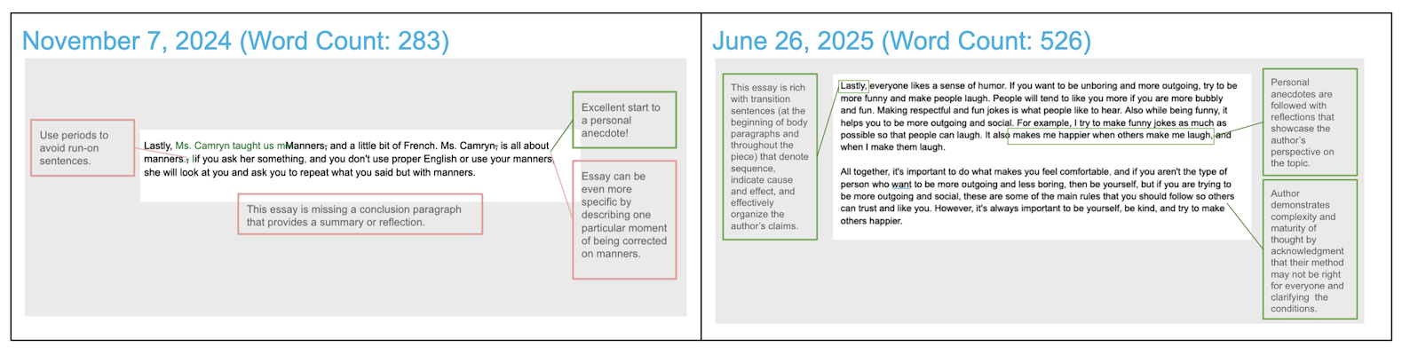 Note on qualitative progress: Although they are not included in this study, we would like to acknowledge the value of qualitative improvements we have observed as teachers, including curiosity, confidence, motivation, and passion for writing.